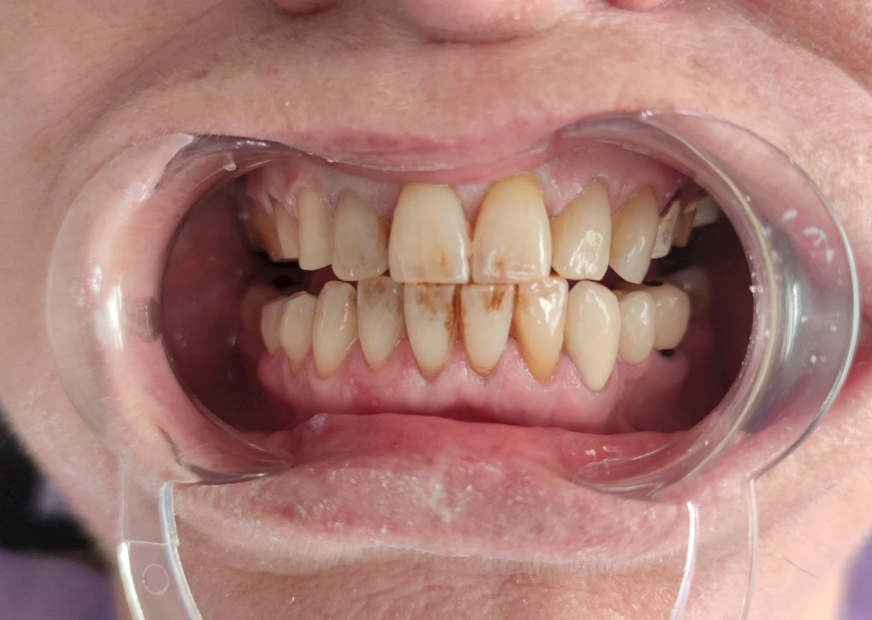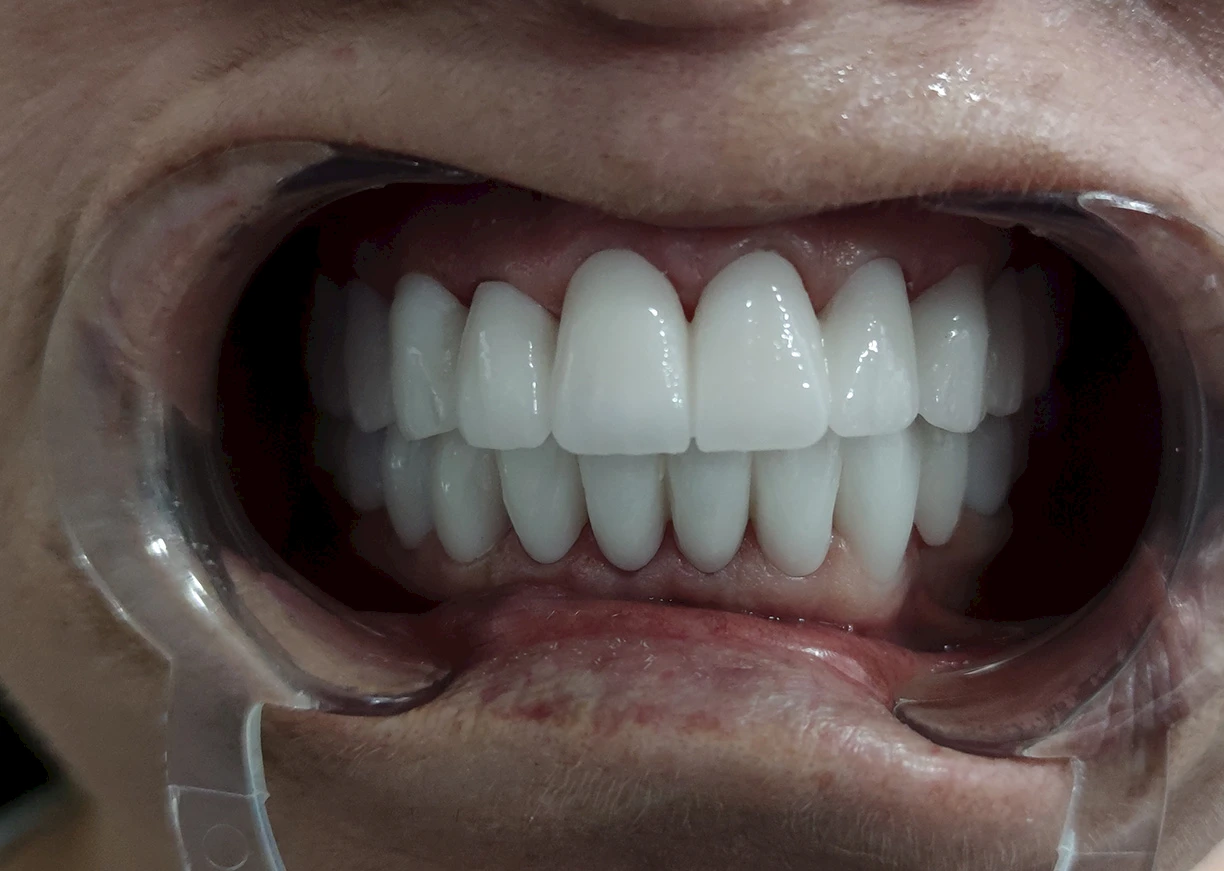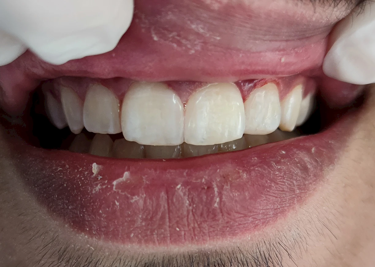 Deze foto laat het grote verschil zien dat houtfineer kan maken. Uit een eerdere foto van de patiënt blijkt dat hij verschillende misvormde en verkleurde tanden had, wat zijn glimlach negatief beïnvloedde. De volgende afbeelding toont een patiënt na het installeren van porseleinen veneers. Porseleinen veneers maken de tanden van de patiënt witter en geven een nieuwe vorm, waardoor ze een mooie, natuurlijk ogende glimlach krijgen. Ervaar de transformerende effecten van porseleinen veneers met voor-en-na-foto's die een verbeterde glimlachesthetiek en correctie van tandheelkundige onvolkomenheden laten zien. Ontdek de zelfvertrouwenboost en de stralende glimlach die worden bereikt met een op maat gemaakte fineerbehandeling.