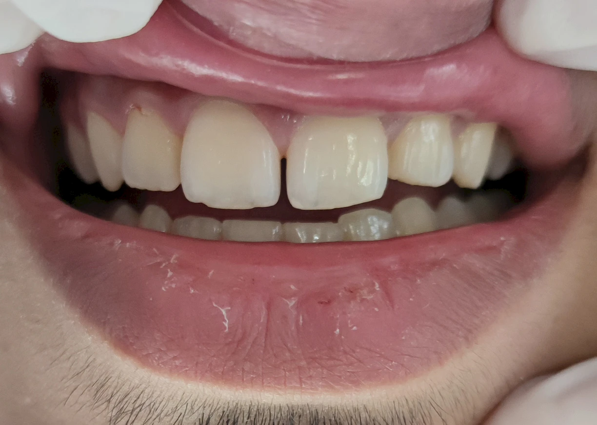 Deze foto laat de verbluffende resultaten zien die u kunt bereiken met laminaatvloeren. Op de frontale foto van de patiënt is een opening tussen de voortanden te zien. De volgende afbeelding toont een patiënt na het installeren van porseleinen veneers. Fineerwerk herstelde de tanden en het zelfvertrouwen van de patiënt. Ervaar de transformerende effecten van porseleinen veneers met voor-en-na-foto's die een verbeterde glimlachesthetiek en correctie van tandheelkundige onvolkomenheden laten zien. Ontdek de zelfvertrouwenboost en de stralende glimlach die worden bereikt met een op maat gemaakte fineerbehandeling.