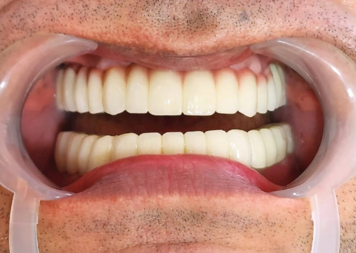 Dental implant uygulaması öncesi ve sonrası görünümü. Paylaşılan vaka görsellerinde, diş eksikliklerinin implant destekli restorasyonlar ile fonksiyonel rehabilitasyonu görülmektedir. Diş kayıpları; çiğneme fonksiyonu, konuşma ve ağız estetiği üzerinde etkili olabilmektedir. Dental implantlar, eksik dişlerin yerine konulması ve ağız fonksiyonlarının iyileştirilmesi amacıyla kişiye özel planlanan cerrahi bir yöntemdir.